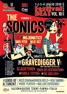 É um dos principais festivais de garage da Europa e vai decorrer brevemente em Italia - nas termas de Salsomaggiore (Parma)- nos próximos dias 1,2,3 e 4 de Julho. Os veteranos e míticos Sonics são estrelas de um certame já emblemático, perto de atingir a 18ª edição. No ano passado, os Pretty Things e os Trashmen foram os nomes mais sonantes. Mas o cartaz de quatro dias está recheado de cartas vistosas, que garantem actuações potentes, como Lords of Altamont, Graveddiger V, David Peter and the Wilde Sect, Tokyo Sex Destruction os ou locais Mojomatics. Temperado por águas medicinais e relaxantes, dinamizado por um alinhamento brutal de bandas de garage, o Festival Beat oferece ainda por noite um naipe categorizado de dj's de toda a Europa. Mas as festas e o ambiente sedutor em redor do festival acontecem quase a todas as horas, desde concentrações, mostras de cinema a exposições vintage. A informação está toda no myspace, o cartaz lá bem chapado para aproveitar. O ambiente será ainda requintado pelo serviço permanente do melhor vinho da casa e a inevitável comida italiana.